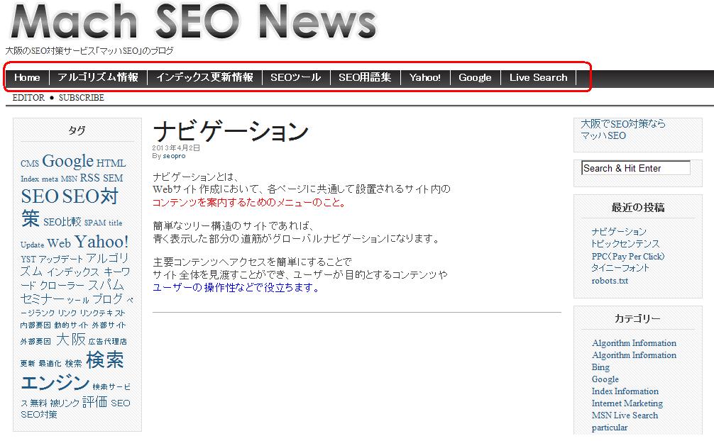 サイト内のすべてのページ、で主要なページへのリンクが張られた